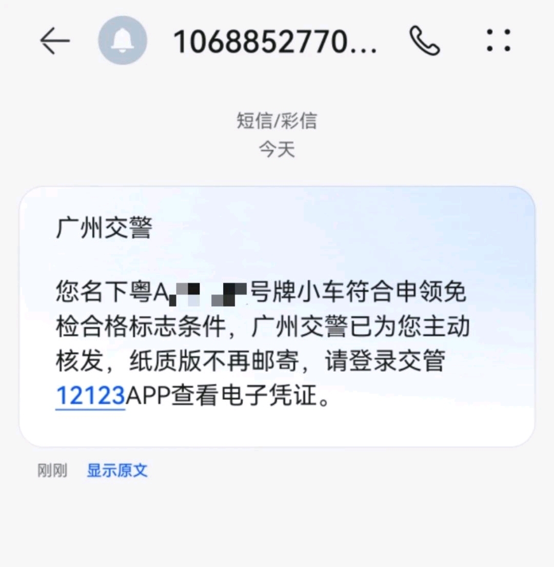 短信模板如下:【广州交警】您名下粤AXXXXX号牌车辆符合申领免检合格标志条件,广州交警已为您主动核发,纸质版不再邮寄,请登录交管12123APP查看电子凭证。
